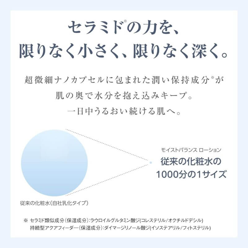 独自のナノカプセル化技術により、すぐれた保湿成分が角質層の隅々までパーフェクトに行き渡るので、保湿命の美容女子にもおすすめです。