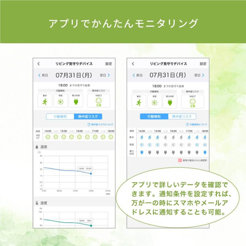 いつも通りの生活が送れているかを、さりげなくチェックし、例えば、動きがなければ寝込んでいないか、温度が高ければ熱中症対策ではないか、連絡する目安に。
