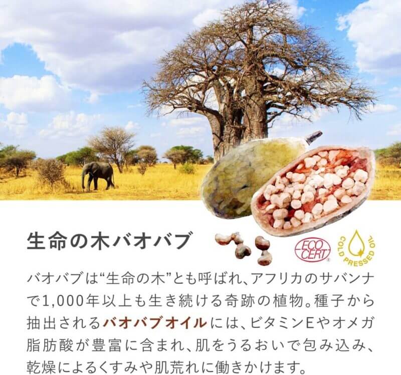 バオバブオイルには、ビタミンA・E・Fといった栄養が含まれています。