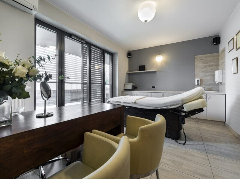 施術室は広々としていて清潔感があり、快適に利用できるパウダールームも完備しています。