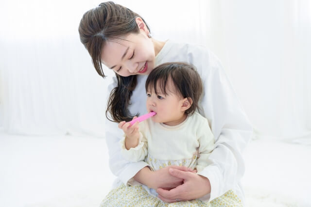 歯磨き後口をゆすいでもらいますが、上手くできない場合は水で濡らしたガーゼで拭ってあげてください。