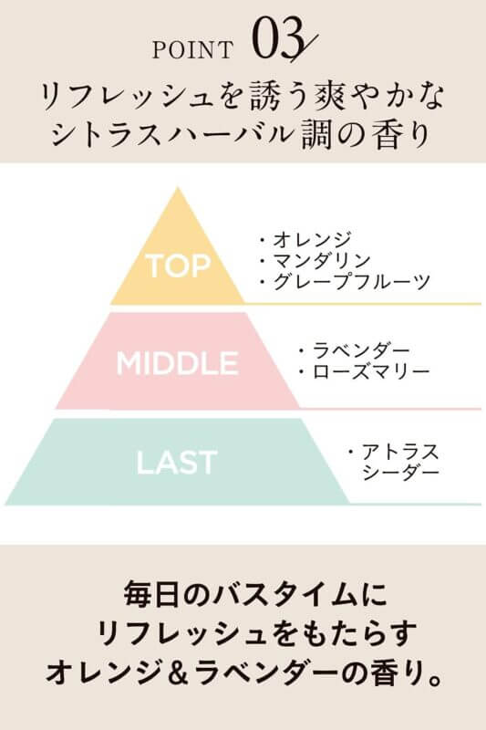 合成香料不使用で、香りに敏感な方にもおすすめで、シトラスハーバルの甘く爽やかさを感じる香りで心までほぐれるようなバスタイムに。