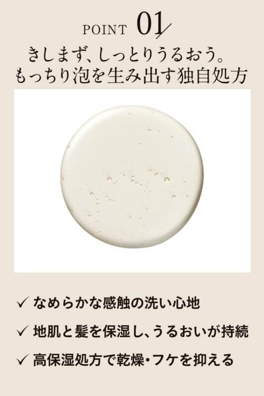 泡立ちは少量でもしっかりモコモコ、ノンシリコン処方でもきしみにくく、すすぎ後はしっとり感が残ります。