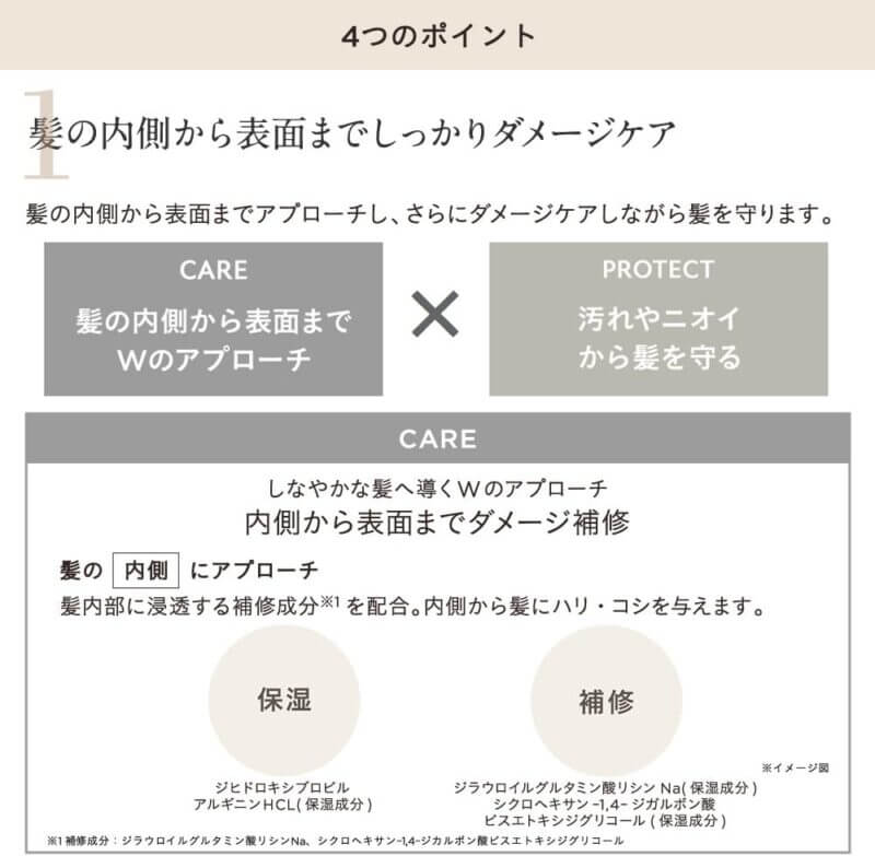加水分解ケラチン(羊毛由来)、γ-ドコサラクトン → 髪の内部と外側をWケア。傷んだ髪を補修し、ハリ・コシをサポート。