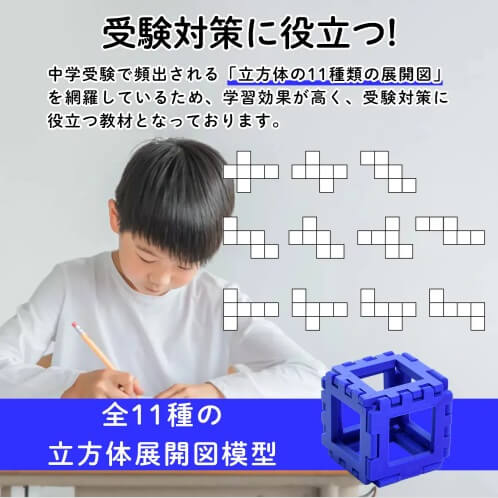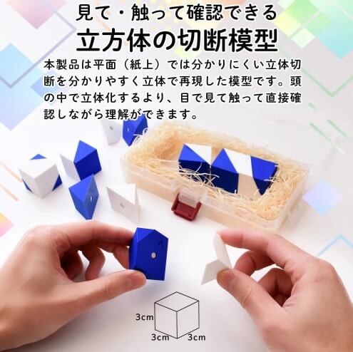 中学受験で頻出する切断面の問題に対応したモデル、立方体を切ったときに生まれる断面を体感的に理解可能。 - 11種の展開図模型