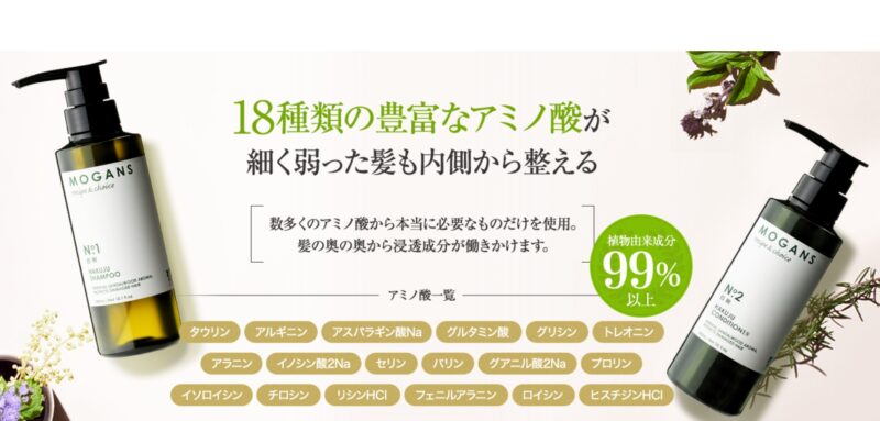 トラベルキット MOGANS(モーガンズ)は18種類以上のアミノ酸成分を配合、ヤシ由来の洗浄成分が髪と地肌をやさしくケアしながら洗い上げるシャンプー。