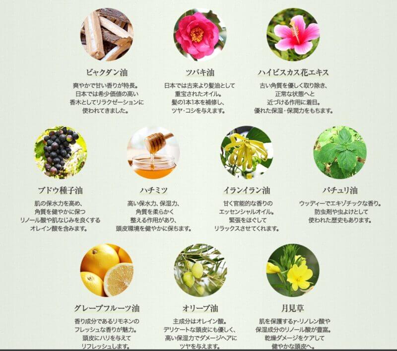 | 植物オイル(オリーブ果実油・月見草油・ツバキ種子油・ヒマワリ種子油・ブドウ種子油) | 髪の補修・ツヤ出し・やわらかさ向上 |
