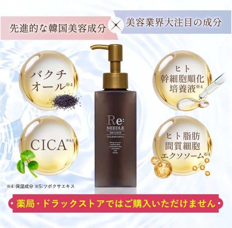 リニードル エマルジョンは、「ヒト脂肪由来幹細胞順化培養液」や「エクソソーム」といった先進美容成分を配合。