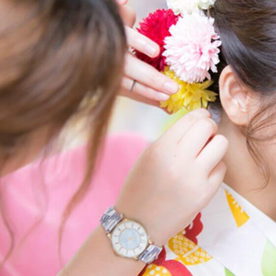 咲く都では、経験豊富なスタッフが、一人ひとりに合わせて丁寧に着付けとヘアセットを行います。