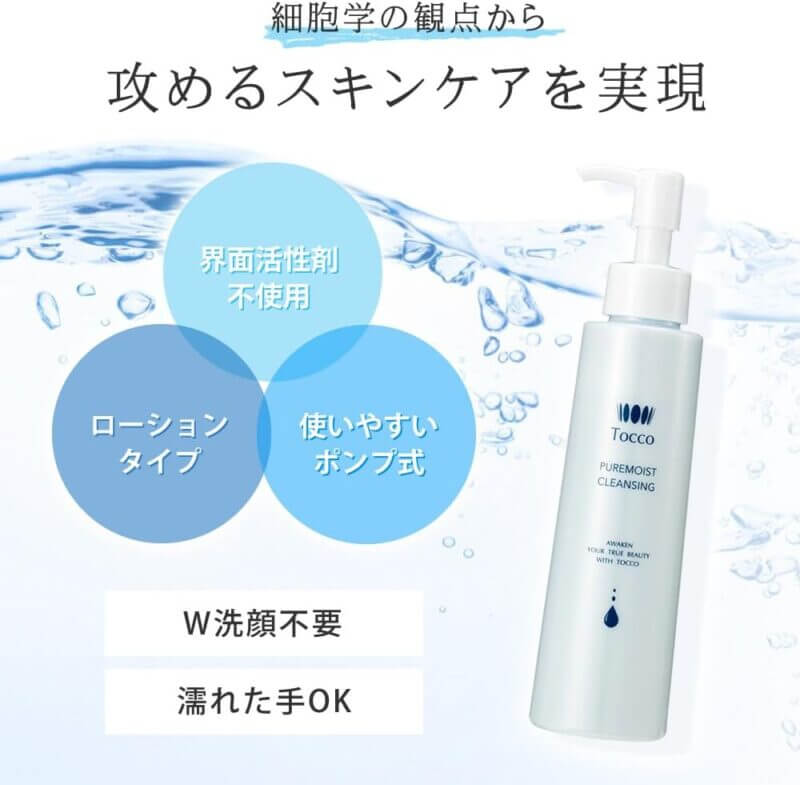 Tocco ピュアモイストクレンジングは、洗い上がりのしっとり感がまるで美容液でケアした後の様だと話題。
